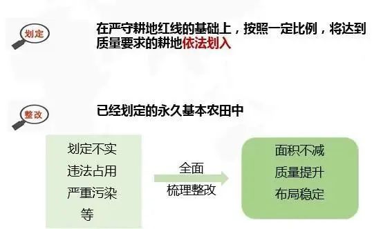 永久基本农田是保障国家粮食安全和重要农产品供给,实施永久特殊保护的耕地。依据耕地现状分布,根据耕地质量、粮食作物种植情况、土壤污染状况,在严守耕地红线基础上,按照一定比例,将达到质量要求的耕地依法划入。已经划定的永久基本农田中存在划定不实、违法占用、严重污染等问题的要全面梳理整改,确保永久基本农田面积不减、质量提升、布局稳定。